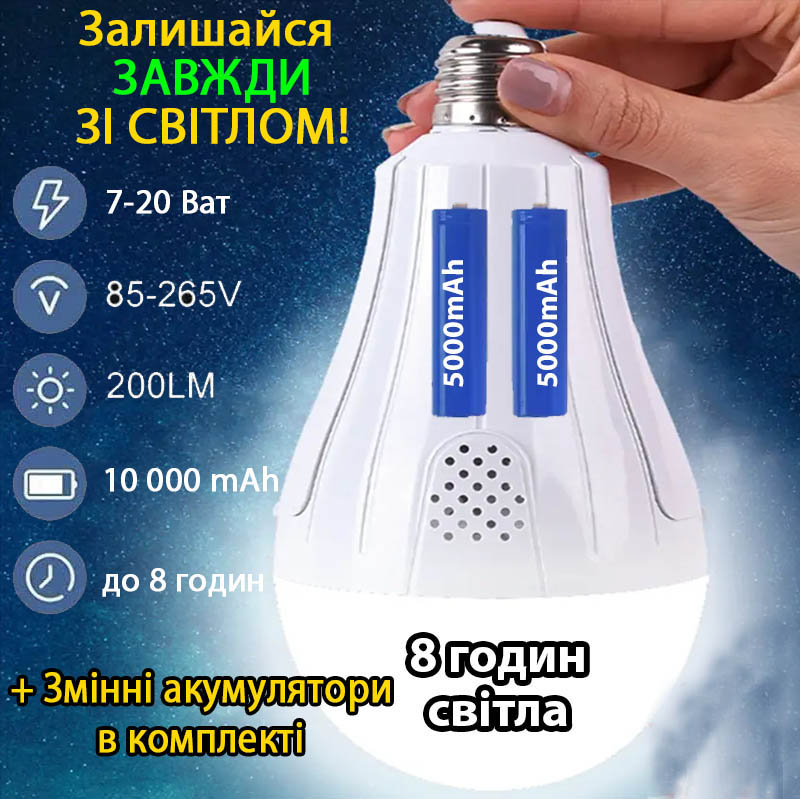 Світлодіодна лампа E27 з акумулятором – це освітлювальний елемент, який має бути в будь-якому будинку, на випадок, якщо несподівано відключили електрику. Завдяки замінним акумуляторам, лампа може в автономному режимі освітлювати приміщення без електрики до 8 годин.